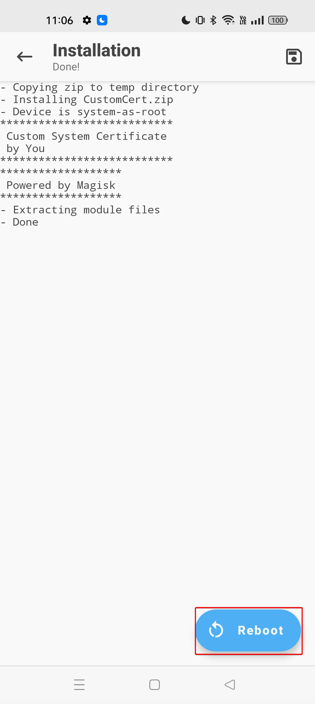 5. Observe the CustomCert.zip is installed successfully and click the “Reboot” button.