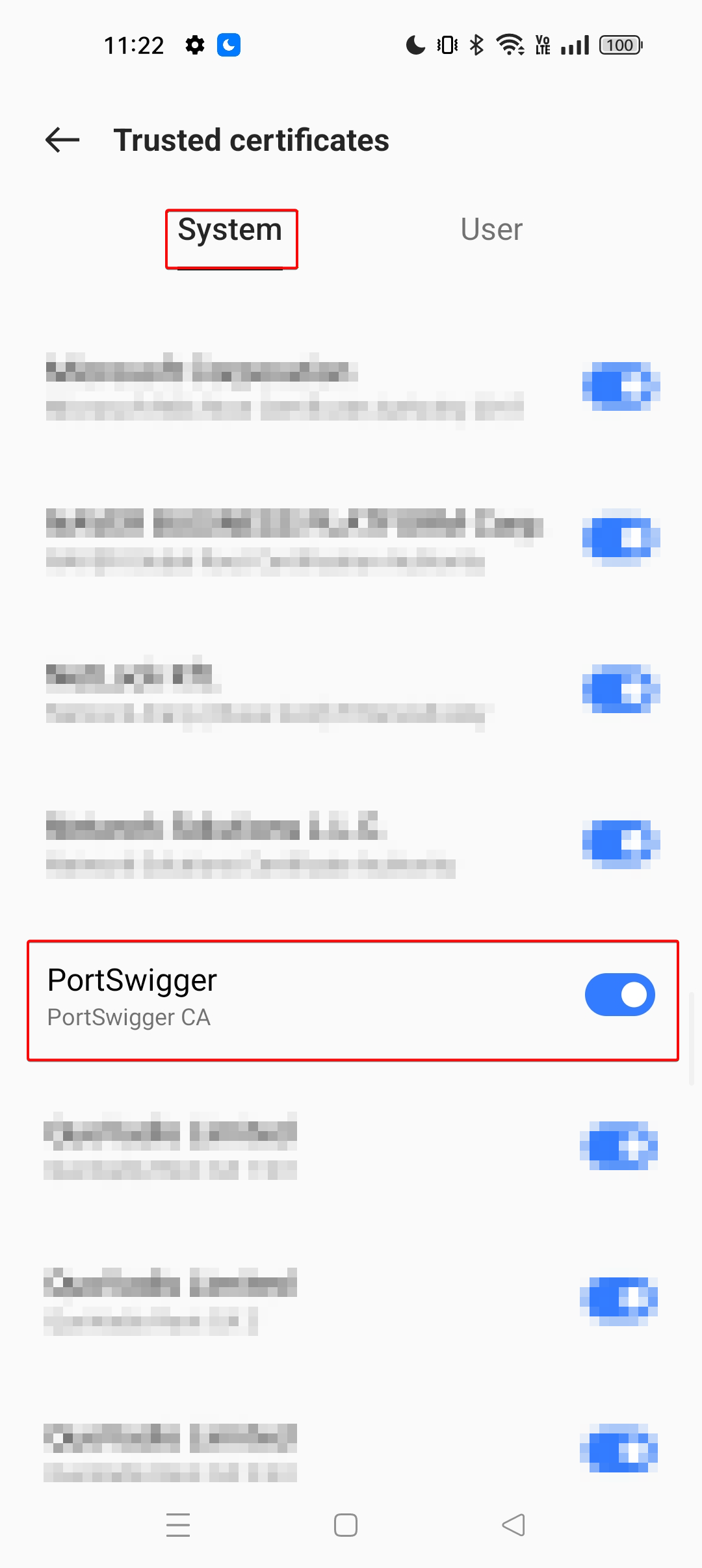 6. Open “Settings” application, search for “Trusted Certificates”, under system scroll down and search for “PortSwigger CA” and observer that PortSwigger CA is installed as system certificate.