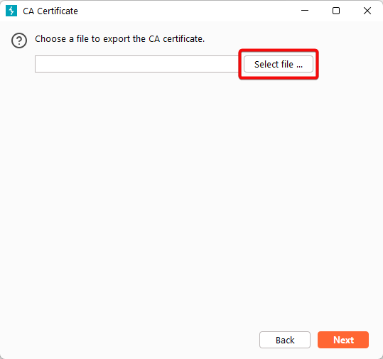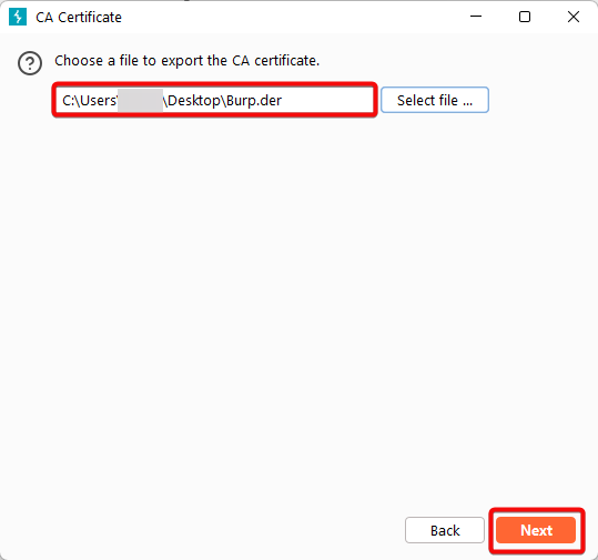 4. Click “Select file”, choose the location where you want to save the certificate, and name the file Burp.der.